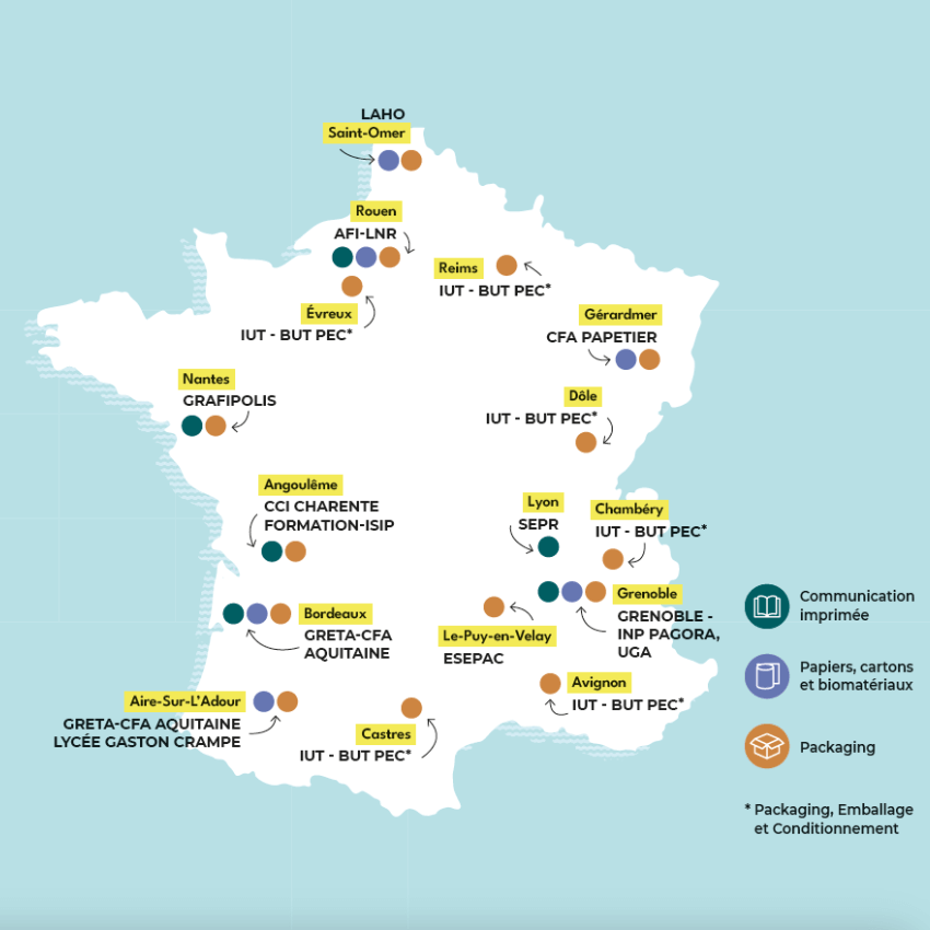 Le réseau formation de l’AFIFOR est unique en Europe ; il réunit 15 établissements, écoles et CFA, formant du niveau Bac Pro au diplôme d’ingénieur sur les métiers de la fibre de cellulose, du papier et des biomatériaux, du packaging et de la communication imprimée.